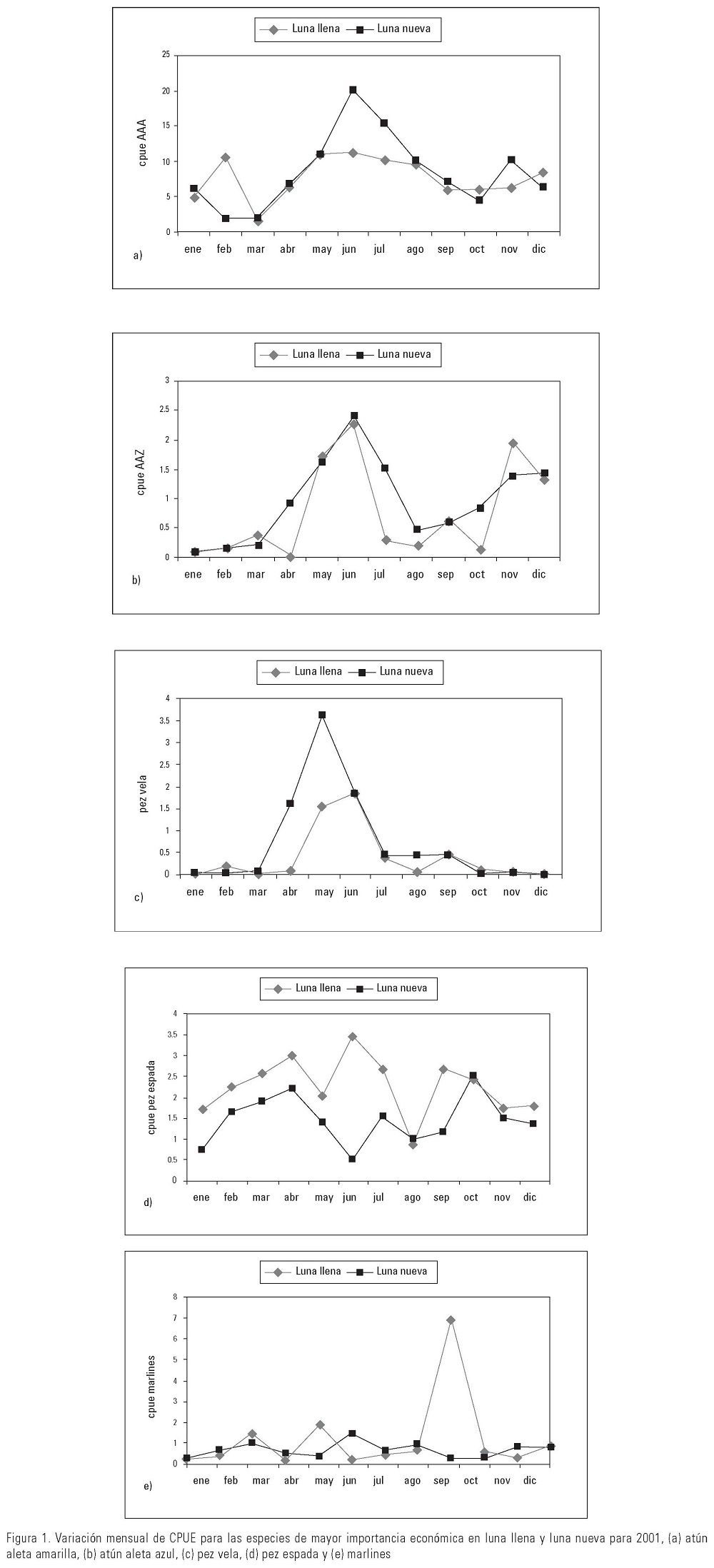 Se calculó la CPUE mensual en ambas fases lunares para el AAA y las especies de mayor importancia económica capturadas incidentalmente: AAZ, el pez vela, el pez espada y las diferentes especies de marlín en conjunto, que en términos de captura representaron respectivamente el 6%, 4.3%, 2.1% y 7.7%.