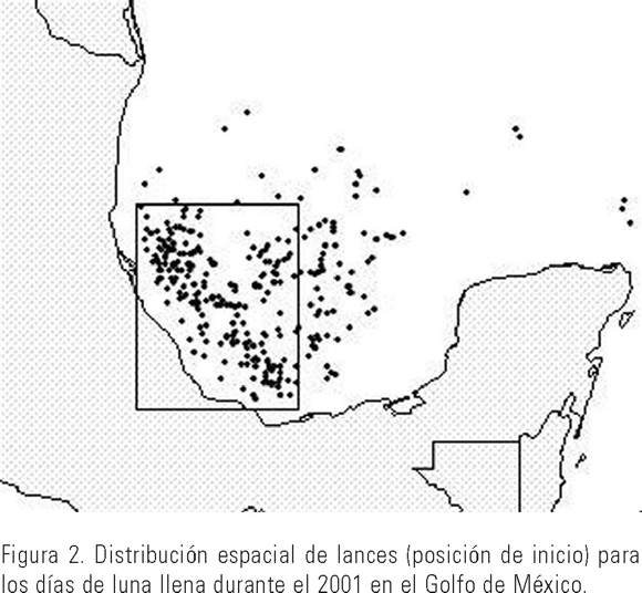 Dicha información fue utilizada para elaborar mapas de distribución y concentración de lances y detectar zonas predominantes de captura relacionadas con las fases lunares.