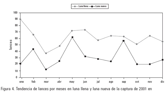 Se observó una mayor tendencia de lances para todos los meses en luna nueva, con un total de 741 lances, y 371 lances en luna llena que representan 32% y 16%, respectivamente, del total de lances en el año (Fig. 4).