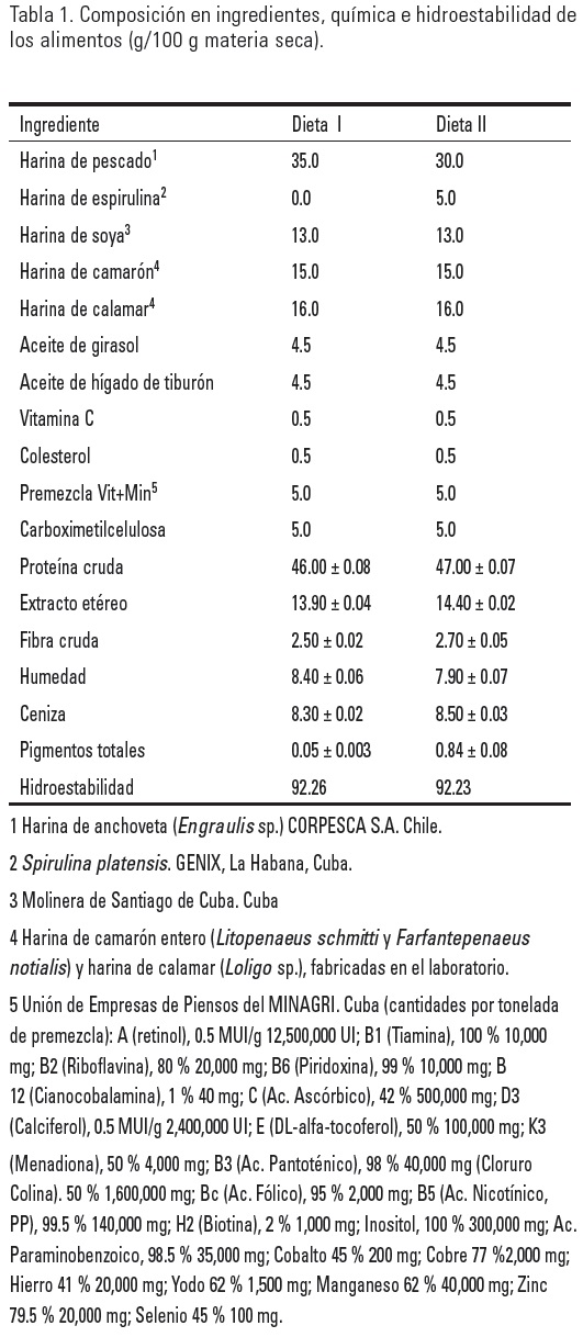Elaboración de alimentos experimentales. Se formularon dos alimentos, conteniendo 0 y 5% de harina de Spirulina platensis (Tabla 1). Para su elaboración, los ingredientes secos con tamaño de partícula de 50 µm, fueron pesados según las cantidades establecidas en la fórmula y mezclados en una mezcladora doméstica de 1 kg de capacidad. Después, los aceites (aceite de girasol y aceite de hígado de tiburón) fueron añadidos en forma de emulsión, se mezclaron y posteriormente se adicionaron aproximadamente 250 mL de agua/kg de mezcla, hasta su completa homogeneización. La mezcla resultante fue pasada por un molino de carne (criba de 2 mm de diámetro) y los pellets obtenidos fueron cortados con una espátula y secados en una estufa con recirculación de aire forzado a 60°C durante 10 horas.