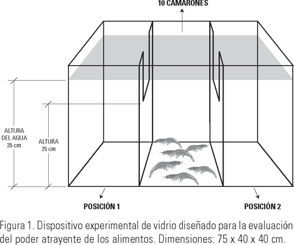 Experimentación. El dispositivo experimental consistió en un acuario de vidrio de 75 x 40 x 40 cm, en el cual se colocaron dos paredes internas de vidrio que permitieron que el acuario quedara dividido en tres partes iguales (derecha-central-izquierda) (Fig. 1). Los camarones, en un total de 10, se ubicaron en la parte central del acuario, teniendo acceso a cualquiera de las otras partes; en éstas se depositaron los alimentos a razón del 20% de la biomasa de los camarones, para evitar que la cantidad de alimento pudiera interferir en los resultados.