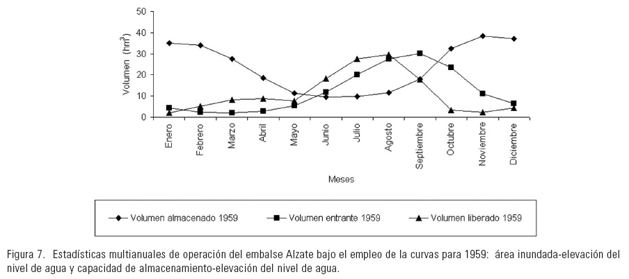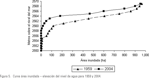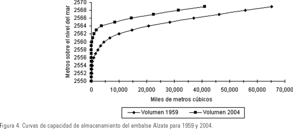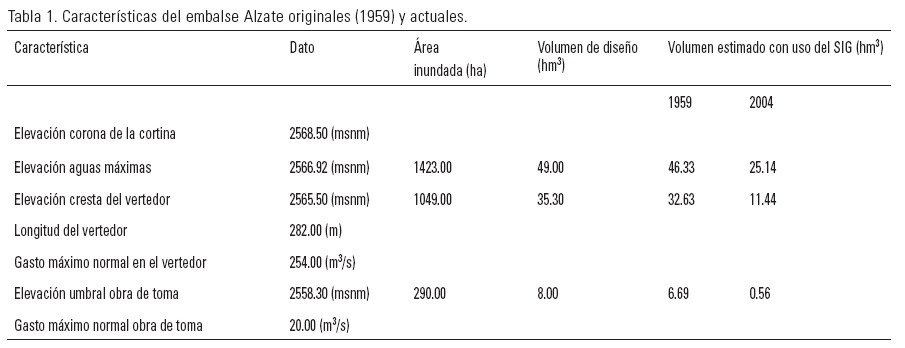 Para el análisis también se contó con la topografía original del año 1959 utilizada para la definición del sitio de construcción de la cortina del embalse Alzate. El análisis de los conjuntos de información batimétrica se realizó con el paquete de sistema de información geográfica (SIG) Idrisi (Eastman, 2003). El plano topográfico de 1959 a escala 1:20 000 fue digitalizado y procesado en el sistema de información geográfica Idrisi con la finalidad de obtener las curvas de capacidad de almacenamiento versus los niveles de inundación y del área inundada versus la elevación del nivel de agua.