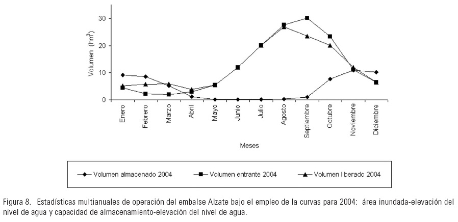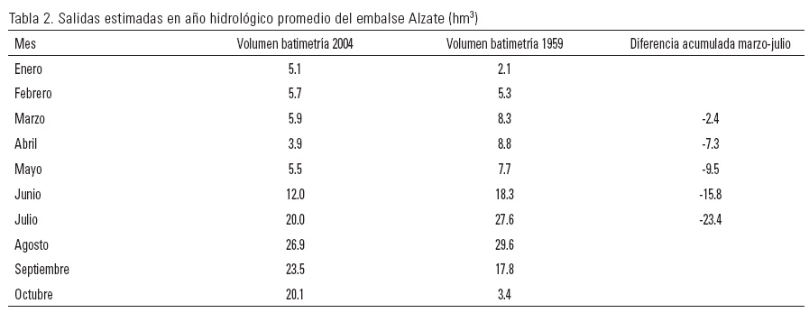 Posteriormente se realizó una sustracción matricial entre las dos capas batimétricas para obtener la columna de sedimentos acumulados para todos los puntos circunscritos en el embalse (Fig. 6). Con los resultados, se construyó la tabla 1 que resume las características originales y actuales del embalse. Los datos demuestran una reducción significativa del volumen regulador del embalse lo cual le impide cumplir adecuadamente sus funciones de control de inundaciones y suministro de agua para riego aguas abajo. Para cuantificar esa deficiencia se compararon los volúmenes de salida del embalse estimados por la Comisión Nacional del Agua (CNA) con base en la capacidad original del embalse (Fig. 7) y los volúmenes actuales de acuerdo con la curva de capacidad revisada (Fig.8). Se comprobó que para los meses críticos de irrigación comprendidos entre marzo y julio actualmente el embalse no alcanza a suministrar en un año promedio los 70.7 hm3 que se estimaban con la curva de capacidad original sino tan sólo 47.3 hm3, es decir 23.4 hm3 menos de lo previsto tal como se presenta en la tabla 2.