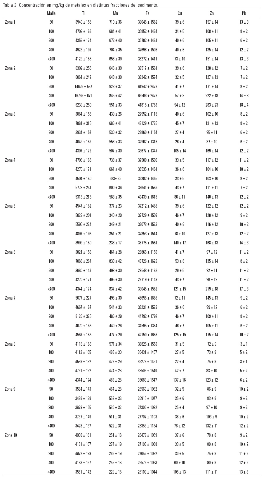 Por otro lado, la tabla 3 muestra la concentración en mg/kg de Fe, Cu, Zn, Ti, Mn y Pb en las diferentes zonas del cuerpo de agua. Los resultados mostraron una considerable variación en la concentración de tales elementos en las diferentes zonas del embalse. La mayor concentración de Cu se encontró en las zonas 5 y 8 y los mayores niveles de Zn y Pb en las zonas 2 y 6, ambos en la fracción más fina del azolve. El Fe, Mn y Ti presentan las mayores concentraciones en la zona 2 en las fracciones de tamaño de grano intermedio.