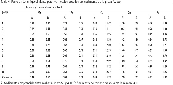 Los resultados obtenidos de los cálculos de los factores de enriquecimiento (FE) se muestran en la tabla 4. Estos valores, indican que la mayoría de los elementos, no demostraron enriquecimientos por contribuciones naturales y antropogénicas a los sedimentos del embalse Alzate; únicamente el Cu y el Zn en la fracción menor a malla 400 presentaron un FE promedio ligeramente alto (Cu = 1.98 y Zn = 2.37), mientras que todos los metales para el material retenido en las mallas 50 a 400 presentaron, en promedio, FE bajos (Mn = 0.49, Fe = 0.63, Cu = 0.69, Zn = 1.35, Pb = 0.61).