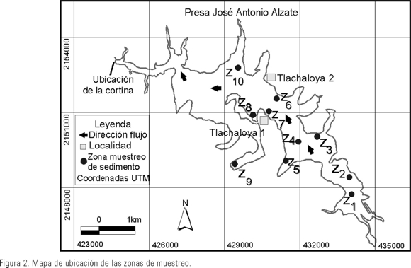 Muestreo de sedimentos. Para llevar a cabo el análisis de la concentración de metales pesados en el lecho del embalse se seleccionaron estratégicamente un conjunto de 10 zonas de muestreo (numeradas del 1 al 10), ubicadas en diferentes sitios del embalse Alzate considerando la dirección del flujo de agua (Fig. 2). La selección de las zonas de muestreo de sedimento se basó en trabajos previos, los cuales indican las zonas de acumulación significativa (Barceló-Quintal, 2000; Ávila-Pérez et al., 1999) y fueron también considerados aspectos de accesibilidad y cobertura espacial. Las muestras de sedimento se colectaron con ayuda de una draga de acero inoxidable tipo Ponar. Aproximadamente 5 kg de sedimento fueron extraídos de la parte media de la draga, colocados en bolsas de polietileno y mantenidos a 4oC durante su transporte al laboratorio donde fueron secados en contenedores de plástico en una estufa a 50oC por 48 h.