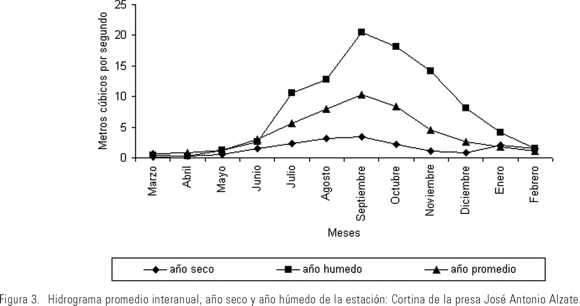 En la figura 3 se presentan los hidrogramas promedio interanual de caudales ponderados hasta la cortina del embalse Alzate. El coeficiente de ponderación para los caudales de la estación las Trojes fue de 2.19 y para la suma de caudales de las estaciones La Y y Calixtlahuaca fue de 1.082, tal como se muestra en la expresión siguiente (Hunt et al., 2002).