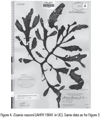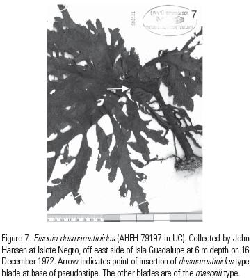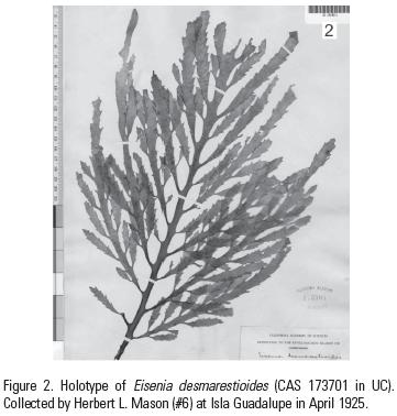 In Silva and Chacana (2005) the suggestion was made that Eisenia desmarestioides and E. masonii, two species described from Isla Guadalupe in the same publication by Setchell and Gardner (1930), were conspecific. The documentation for this suggestion is presented here.