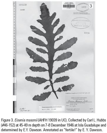 In cooperation with the San Diego Natural History Museum, the J. W. Sefton Foundation sponsored an expedition to the islands off the coast of Baja California in January 1950, operating with the R.V. Orca. As phycologist on that expedition, I collected entire thalli of Eisenia on rocks in the upper subtidal zone at West Anchorage, Isla Guadalupe, and several more from dredge hauls taken at Caleta Melpómene. In addition, Conrad Limbaugh, the designated diver of the expedition, collected an entire thallus in Caleta Melpómene at a depth of 45 m. These collections confirmed that the generic placement of E. masonii and E. desmarestioides by Setchell and Gardner was correct, although the degree of dissection of the blades was unmatched in all other species of the genus.