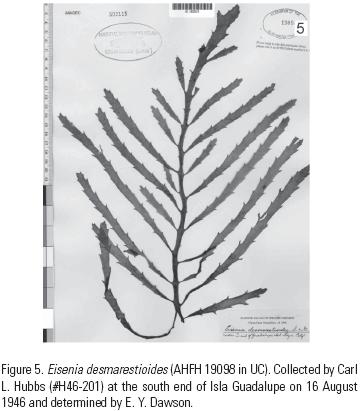 A fragmentary blade with very long and narrow simple pinnae was collected at the same site on Isla Guadalupe by Carl L. Hubbs in August 1946 while on the FlynnZaca Expedition. This specimen (Fig. 5) was identified by E. Yale Dawson as E. desmarestioides. Two additional fragmentary blades (Figs. 3, 4) were collected by Hubbs in December 1946 while on the E. W. Scripps Expedition.