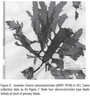 Fertile sori occur on masoniitype blades (Figs. 3, 4), but have not been observed on desmarestioides blades. Thus, despite their specific location at the base of the pseudostipes and their strong morphological differentiation, these blades are not specialized sporophylls. This blade dimorphism has not been observed in other species of Eisenia. While the basis of the morphological variability in Eisenia spp. on Isla Guadalupe cannot be deduced without further study, it is clear that only one species is involved, for which I choose to retain the name Eisenia desmarestioides.
