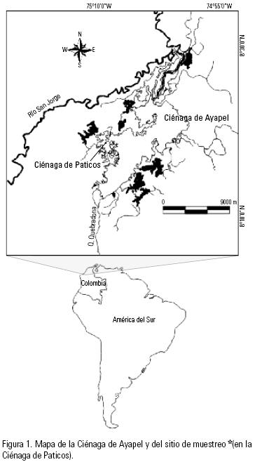 El sistema cenagoso de Ayapel se ubica en la jurisdicción del municipio de Ayapel, en el departamento de Córdoba, en la planicie atlántica del norte de Colombia (Fig. 1). Forma parte del macrosistema de humedales y zonas anegables de la depresión Momposina. La cuenca de la ciénaga tiene un área de 1 504 km2, situada entre 20 y 150 msnm. El territorio se ubica en la zona de bosque húmedo tropical, con temperaturas entre los 26 y 29 °C (IGAC, 1986). El régimen de precipitaciones fluctúa entre un periodo de lluvias (abril y noviembre) y de sequía (diciembre y marzo). Geográficamente, la zona se encuentra en la vertiente oriental del río San Jorge, y en la parte occidental media del complejo cenagoso de Ayapel, se encuentra la ciénaga de Paticos a los 8°04' 8°30' LN y 74°84' 75°20' LO. El drenaje es dendrítico y presenta longitudes variables, siendo el principal afluente de la Ciénaga de Paticos, la quebrada de Ayapel, una fuente deteriorada que recibe los desperdicios del matadero del municipio de Ayapel (Chalarca et al, 2007).