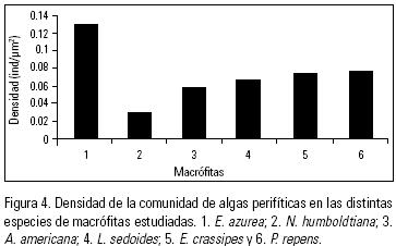 La densidad del ficoperifiton (Fig. 4) presentó un valor máximo de 0.15 ind/µm2 reportado en las raíces de Eichhornia azurea y un valor mínimo de 0.0004 ind/µm2 asociado a Nymphoides humboldtiana, con un valor promedio de densidad ficoperifítica de 0.013 ind/µm2, el cual se incrementó de acuerdo a la complejidad estructural de la raíz. La prueba de varianza mostró diferencias altamente significativas para la densidad del ficoperifiton (p < 0.05).