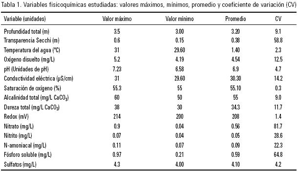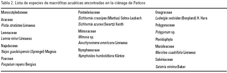 Caracterización de la ciénaga. Las variables físicas y químicas evaluadas en el agua subsuperficial en las zonas de recolección de las macrófitas presentaron un pH ligeramente ácido (6.9 unidades de pH), baja conductividad eléctrica (30.3 µS cm1), concentración y saturación de oxígeno subsaturadas (4.5 mg l1, 55%), alcalinidad (55 mg l1 de CaCO3), dureza total (34.3 mmol l1 de CaCO3) y transparencia (0.38 m). El agua presentó características oxidantes (208 mV), una temperatura elevada (28.9 °C), una profundidad de la columna de agua de 3.2 m, valores altos de nutrimentos tales como, fósforo soluble reactivo (0.59 mg l1), nitrógeno amoniacal (0.08 mg l1), nitratos (0.47 mg l1), nitritos (0.07 mg l1) y sulfatos (4.15 mg l1; Tabla 1).