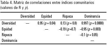 Al evaluar la comunidad ficoperifítica se identificaron diferencias entre las muestras de las distintas macrófitas respecto a la diversidad, equidad, dominancia y riqueza numérica de especies (p < 0.05). La correlación de Spearman entre la diversidad y la riqueza numérica de especies no fue significativa (p > 0,05) pero si lo fue entre la diversidad y la equidad (p < 0.05; Tabla 4).