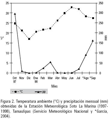 De la estación meteorológica de Soto la Marina se obtuvieron los datos de precipitación mensual y temperatura media, disponibles en el Servicio Meteorológico Nacional (19971998), mientras que los datos faltantes para los meses de agosto y septiembre se tomaron de García (2004).