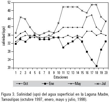 Las variaciones en las condiciones hidrológicas de la Laguna Madre particularmente en lo que se refiere a la salinidad, ya han sido señaladas: así en la región central de la laguna OcañaLuna (2000) registró un intervalo de salinidad de 18.0 a 50.0 ups, por otro lado Hildebrand (1958) en la zona norte (Boca Arroyo del Tigre) hasta 117.0 ups durante la época de secas (julio); mientras que Hildebrand (1969) menciona que entre La Capilla y La Boca Sandoval la menor salinidad fue de 9.0 ups en noviembre debido al efecto del Huracán Beulah.