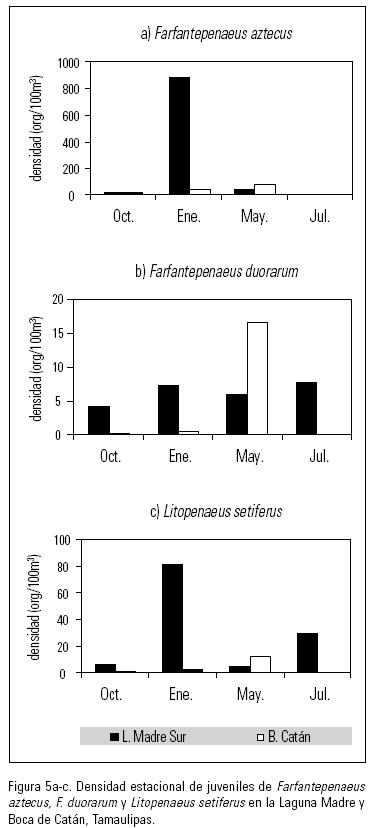 Litopenaeus setiferus (camarón blanco). Los juveniles de esta especie se recolectaron todo el año, con la mayor abundancia en el mes de enero (Tabla 1; Fig. 5c) en la Boca el Caballo (784.0 org/100 m3) donde la temperatura superficial del agua fue de 21.0 °C mientras que la salinidad fue de 32.0 ups; en julio hubo un pico menor (14.2 org/100 m3) en la zona sur desde Punta Algodones hasta la Enramada en temperaturas entre 24.031.0 °C y salinidades de 36.045.0 ups; lo anterior difiere de lo observado en la Bahía de Galveston, Texas, donde ocurrieron solamente de mayo a noviembre (Baxter & Renfro 1967).