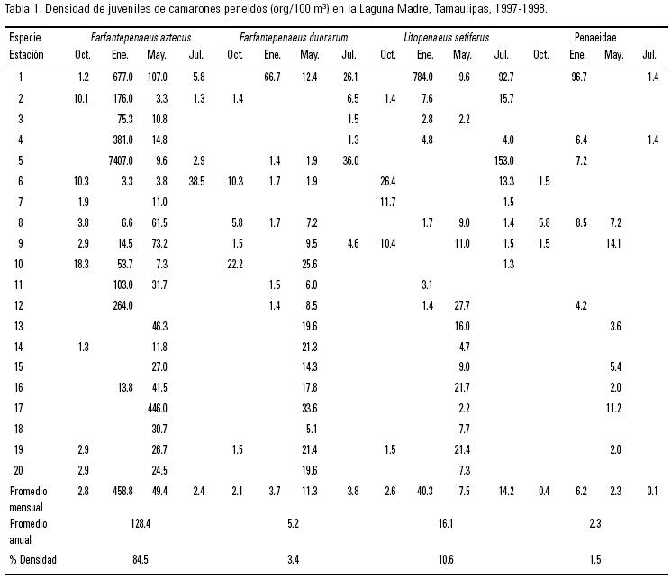 Distribución y abundancia. Se recolectaron un total de 2954 juveniles de camarones peneidos en la Laguna Madre, de los cuales el 84.5% correspondió a F. aztecus, el 10.6% a L. setiferus y el 3.4% a F. duorarum (Tabla 1).