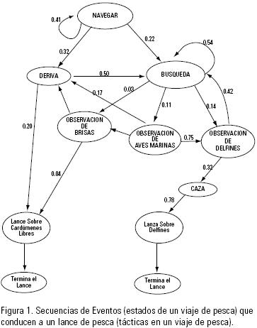 En la Fig. 1 se presenta la gráfica que representa las diferentes tácticas utilizadas en un crucero de pesca. Las trayectorias fueron obtenidas al analizar los eventos más relevantes y sus probabilidades condicionales de la Matriz de Transición presentada en la tabla 2. En general se pueden observar dos tipos de tácticas: la primera aplicando un esfuerzo pesquero sistemático y la segunda realizando un lance de pesca aleatorio. La diferencia entre ellas es que en la primera se puede distinguir claramente un patrón secuencial que lleva finalmente a un lance de pesca; esto es, una sucesión encadenada de búsqueda, seguida de una observación de una señal, una persecución (caza) y finalmente un lance de pesca. En contraste en la segunda, no se sigue un patrón definido y más bien su dinámica está gobernada por factores aleatorios. En las tácticas del esfuerzo pesquero sistemático se reconocieron siete patrones diferentes. Cuatro de ellos, terminaron en un lance sobre cardúmenes asociados con manadas de delfines; las tres restantes, finalizaron en un lance sobre cardúmenes no asociados. Por su parte, se observa una sola trayectoria aleatoria, donde se termina en un lance sobre un cardumen libre (no asociado), después de estados de navegar y deriva.