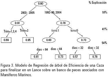 En las estrategias sistemáticas que llevan a un lance de pesca sobre cardúmenes asociados con delfines, la persecución (Caza) es un evento de significativa importancia, donde además se consume bastante energía. En este caso es necesario distinguir también que no siempre concurre el éxito, medido éste como un lance de pesca posterior a la caza. De los resultados obtenidos en este trabajo se deriva que en promedio, más del 20% de las cazas analizadas terminaron en un lance de pesca. El finalizar con un lance de pesca puede depender de la habilidad y la experiencia del capitán para evaluar la situación en cuanto a la velocidad con que se desplaza el cardumen y la especie o la población de delfines a la cual está asociado o bien, a las características ambientales prevalecientes (Sund et al., 1981; Fiedler & Reilly, 1994). Por ejemplo, en presencia de corrientes circulares existe el riesgo de producir embolsamientos en la red de cerco, que pueden causar un incremento en el riesgo de mortalidad incidental de delfines en el lance de pesca, por lo que es altamente probable que un capitán experimentado desista en la maniobra de pesca bajo esas condiciones. En el caso de los cardúmenes no asociados, un capitán de pesca podrá o no realizar un lance, dependiendo de la actividad del cardumen. Por ejemplo, si los peces nadan a gran velocidad la probabilidad de sufrir un accidente se incrementa, por lo que se decidirá no realizar el lance de pesca. Esto es mencionado por Oostenbrugge et al. (2001), quienes comentan que la decisión de llevar a cabo una maniobra de pesca en barcos cerqueros pequeños depende básicamente de minimizar, entre otras cosas, los riegos físicos, más que de maximizar las ganancias como lo indica el supuesto clásico de la Bioeconomía. Así, el conocimiento del capitán para diagnosticar el comportamiento de la manada de delfines (que se muestre tranquila, inquieta, nadando vigorosamente, entre otras), del cardumen y de los factores ambientales prevalentes, pueden llevar a la decisión de terminar la caza con la conclusión de no realizar finalmente el lance de pesca y por tanto no obtener una captura aunque se ha invertido un gran Esfuerzo de Pesca. Es importante comentar que en el presente trabajo se consideró una sola categoría de embarcaciones, sin diferenciarlas de acuerdo con su tamaño y autonomía. Esto fue debido a que este efecto es intrínseco en el factor "Pesquería" del modelo de regresión de árbol, el cual fue construido de acuerdo con la definición de las pesquerías de atún en el OPO, definidas por Maunder y AiresdaSilva (2009), donde se toma en cuenta el factor espacial. Esto permitió disminuir la complejidad del modelo explicativo, apelando al principio de parsimonia.