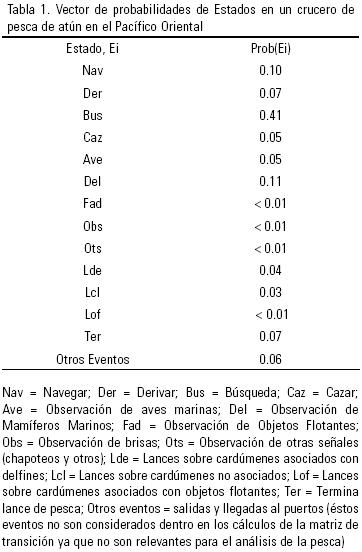 Tácticas de pesca de la flota mexicana. En la tabla 1 se muestra los valores promedio de las probabilidades independientes observadas en los 176 cruceros de pesca, lo que constituye el Vector de Estados. Obsérvese que de los estados que conforman el movimiento del barco, la probabilidad de búsqueda fue la más significativa, con un valor de 0.41. Por su parte, en el grupo de las señales, la mayormente registrada fue la de observación de delfines con 0.11. En cuanto a los eventos de maniobra de pesca, los lances de pesca sobre cardúmenes asociados con delfines son los que registraron una mayor probabilidad con 0.04. La suma de los valores de probabilidad de todos los eventos registrados es igual a uno. Es necesario aclarar, sin embargo, que el análisis de las probabilidades de la tabla 1 se relacionan directamente con la secuencia con la que se anotaron los eventos, más que con lapsos temporales medidos en una unidad de tiempo (por ejemplo, horas).