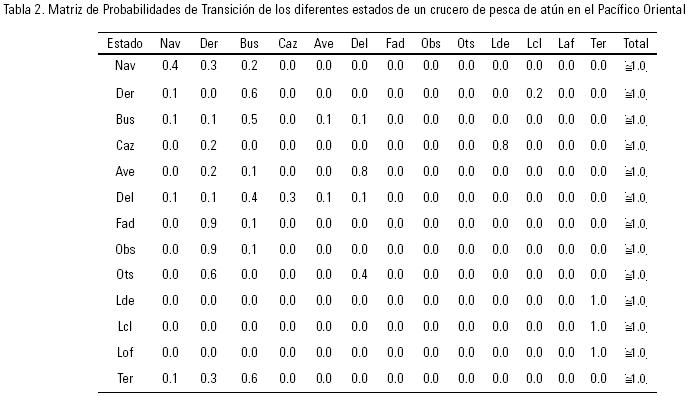 En la tabla 2, se presenta la matriz de transición promedio de los 176 cruceros de pesca de la muestra utilizada. Esta se obtuvo al calcular la media aritmética de cada una de las probabilidades condicionales de todos los cruceros de pesca de la muestra, por lo que se supone que representa un crucero promedio de la flota atunera mexicana durante el periodo estudiado. Cada celda representa el valor de probabilidad condicional promedio de pasar de un estado i a un estado j. Se puede observar que la suma de todas las probabilidades condicionales del iésimo renglón es aproximadamente uno (con diferencias mínimas que se deben al redondeo en las cifras de cada crucero de pesca). Tomando un renglón iésimo es posible entonces obtener los diferentes valores de probabilidad de transición. Por ejemplo, el renglón tres en esa tabla, representa las probabilidades condicionales de pasar a un estado j en el tiempo futuro (t+1), dado que el barco se encuentra en estado de búsqueda en el tiempo actual, (t). De esta forma la probabilidad de que el barco permanezca en estado de búsqueda es de 0.5. Asimismo, la probabilidad de que observe una manada de delfines o aves marinas es de 0.1.