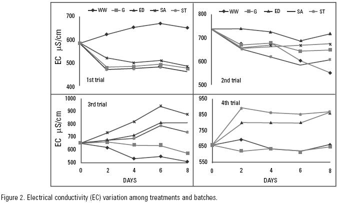 Electrical conductivity (EC): The behavior of the systems was different. The ones with gravel showed differences whereas the system only with WW did not (first and second trials in Fig 2), indicating that the gravel had influence in the changes observed. As time went by gravel lost exchange capacity, becoming saturated, and a biofilm of microorganisms formed in the gravel surface. The systems with plants showed a different behavior as seen in third and forth trials in Fig. 2.