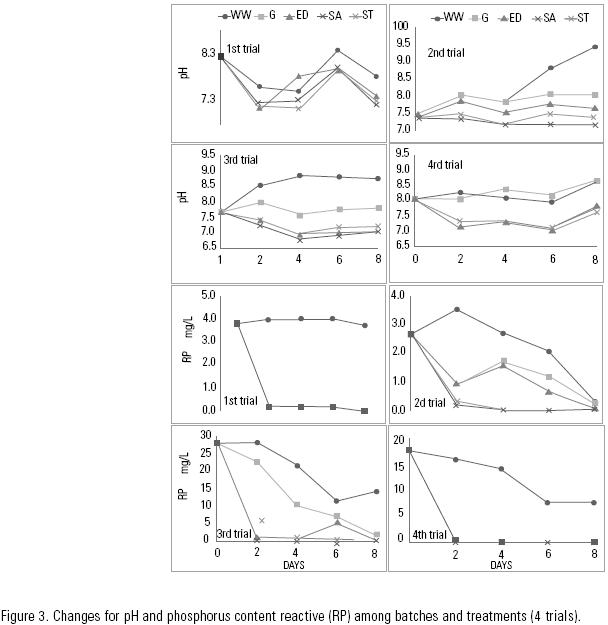 The changes of pH were similar in all systems, except for WW, which showed the highest values at day eight. The rest of the systems did not show significant changes, except for the fourth trial, where it is clearly observed that the systems with plants are separated from the others by a pHunit, see Fig. 3.