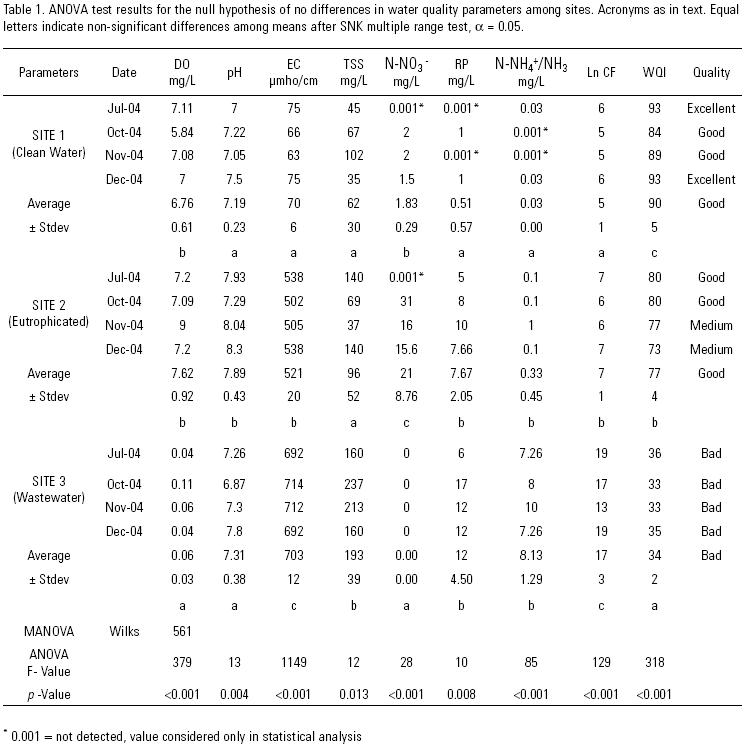 Water quality for each site sampled. Table 1 depicts the characteristics of water quality associated with each sampling station, and the analysis of variance applied showed that differences among parameters and sites were significant. Based on this, the sites were classified as: clean water, wastewater, and eutrophicated water sites (Fig. 1).