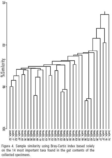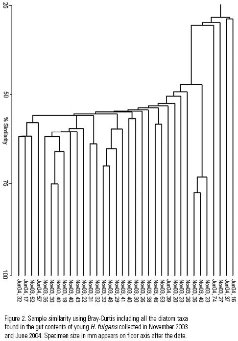 The BrayCurtis index indicated certain similarity between less than half the specimens. This is attributed to the presence of different important taxa in the gut contents of each abalone specimen (Figure 5). Thus, high similarity in the presence/absence of taxa and high S lead us to infer no diatom taxa are preferred by juvenile H. fulgens, and that the importance of certain diatom taxa in their gut contents detected by the BrayCurtis index depends on the patchy distribution of diatoms, that is, on whatever taxon is abundant in a given diatom patch. This agrees with our hypothesis that the young of green abalone feed nonselectively on diatoms in the wild.