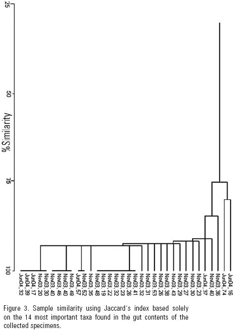 To contrast our Ho, evidence was gathered based on the analyses of species composition and structure of diatom assemblages found in the gut contents of the collected specimens. Species diversity and equitability were estimated using Shannon's H' and Pielou's J', along with Simpson's 1λ (Brower & Zar, 1984). Similarity between gut contents was measured on the basis of presence/absence of taxa with Jaccard index (Magurran, 1988), and also considering their relative abundances using BrayCurtis index (Brower & Zar, 1984). In a first approach, we included all taxa in the analyses and constructed the dendrograms by simple union. In a second approach, only the most abundant taxa were considered, i.e., those representing 80% of the total abundance (N). Also, following SiqueirosBeltrones et al. (2005), similarity was measured between diatom assemblages in the gut contents of the June specimens and from a rock.