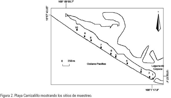 La zona de estudio comprende a la Playa Carrizal (Fig. 1) que se localiza al Noreste de la Boca de la Laguna de Coyuca con una extensión de 3.5 km, se encuentra entre los 16° 56' y 16° 57' latitud Norte y los 100° 07'y 109° 09' longitud Oeste. Es una zona de gran actividad turística, con palapas en su zona de supraplaya. Además de existir 5 campamentos tortugueros con actividades diarias de recorrido en cuatrimotos y una considerable bioturbación por la anidación de las tortugas en toda el área.