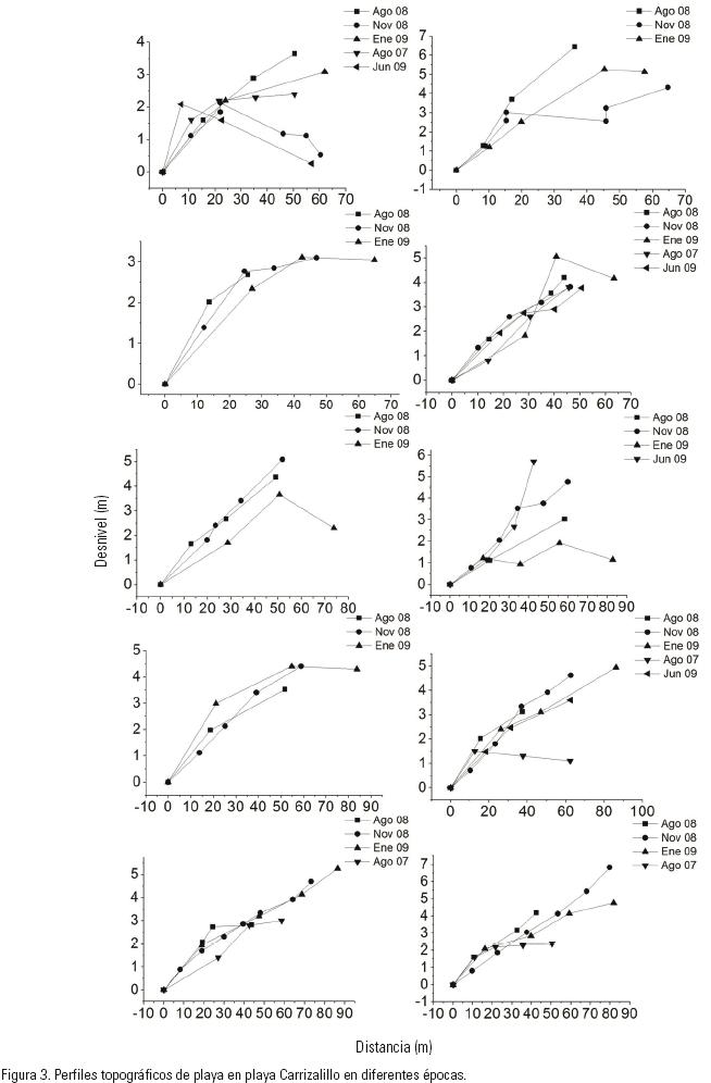 Por último, el perfil 10 muestra para agosto del 2007 y 2008 una etapa acumulativa con una mesoplaya que se extiende hasta 18 m y una supraplaya de 30 m de amplitud. En enero del 2009, la extensión máxima de la playa llega a tener hasta 80m.