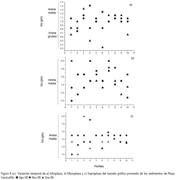 Parámetros granulométricos. De acuerdo con los resultados de los parámetros granulométricos de los sedimentos obtenidos durante las diferentes épocas de muestreo, se observaron las siguientes variaciones texturales: el comportamiento del tamaño gráfico promedio (Fig. 4) muestra en la zona de la infraplaya de los primeros dos perfiles localizados en la boca de la laguna una predominancia de arenas gruesas para las épocas muestreadas, los perfiles 3 y 5 dominan las arenas medias y los perfiles 4 y 6 son los que presentan las mayores variaciones de sedimentos desde arenas medias hasta arenas gruesas. Del perfil 7 al 10 la tendencia de las playas es arena media. Para la época de enero del 2009, se presentan en gran parte de la infraplaya, arenas gruesas, indicando una mayor energía del oleaje y de la corriente litoral causado meses antes y reflejado en enero.