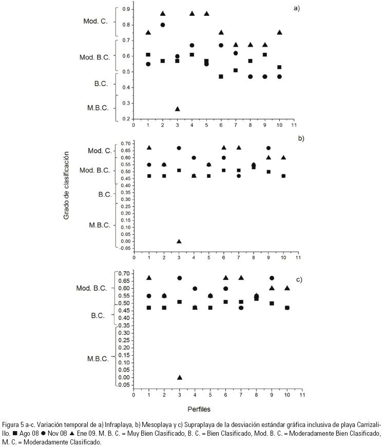 Por lo que se refiere a la desviación estándar gráfica inclusiva (Fig. 5), ésta se presenta en la zona de infraplaya con sedimentos moderadamente bien clasificados a moderadamente clasificados en los primeros 5 perfiles próximos a la boca de la Laguna de Coyuca y los otros 5 perfiles, más distantes, presentan sedimentos moderadamente bien clasificados a bien clasificados, lo cual indica una influencia más lagunar con una mayor variación de tamaños de los sedimentos en los primeros perfiles y en los siguientes una mayor selección de los sedimentos por el oleaje y el transporte litoral.