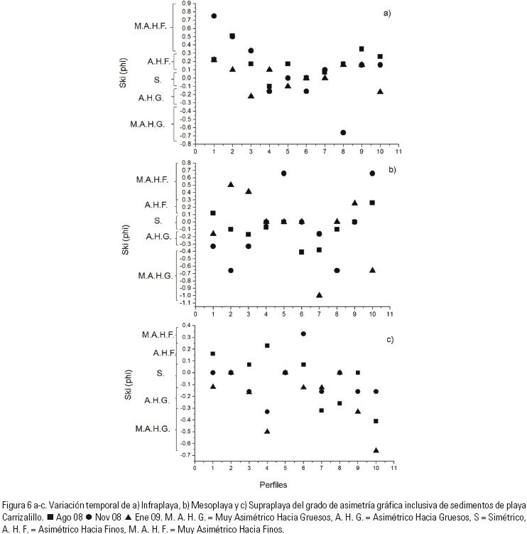 Analizando los valores del grado de asimetría gráfica inclusiva (Fig. 6) se tiene que en la zona de infraplaya existe una variación de los sedimentos muy asimétricos hacia finos del perfil 1 en la boca lagunar hasta simétricos en el perfil 4, a partir de este perfil hasta el perfil 10 son simétricos con una tendencia hacia los simétricos finos.