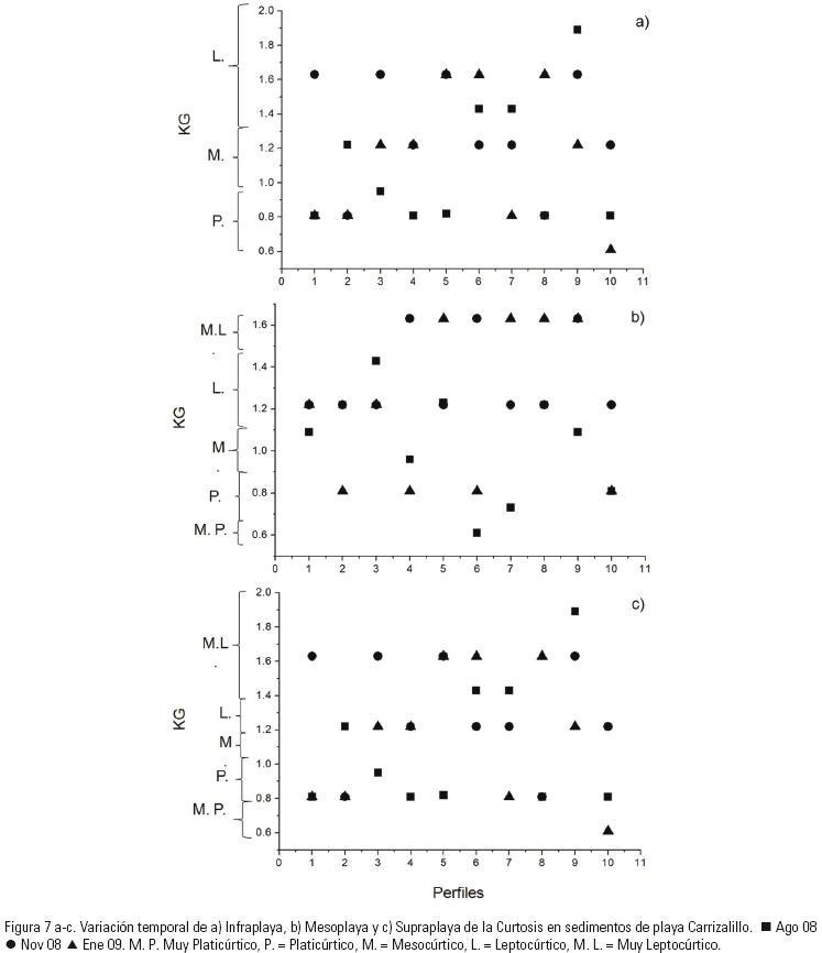 Por otro lado, la curtosis (Fig. 7) muestra sedimentos de infraplaya con tendencia de mesocúrticos a platicúrticos, mientras que en la mesoplaya y supraplaya varían principalmente de mesocúrticos hacia leptocúrticos. Esto significa una mayor variedad de tamaños en la infraplaya por las variaciones energéticas del oleaje y la corriente litoral, mientras que en la mesoplaya y la supraplaya es menor la variedad de tamaños.