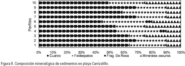 Los resultados de la composición mineralógica de los sedimentos de playa Carrizal se presentan en la Fig. 8, donde se observa que el cuarzo es el mineral más abundante, entre un 50% y 70 %, seguido de feldespatos, minerales oscuros entre un 20% a 30% y fragmentos de roca en menos del 5%. La composición, de acuerdo con el triángulo de clasificación mineralógica (Folk, 1973), los sedimentos son sublitarenitas feldespáticas y feldsarenitas (Fig. 9).
