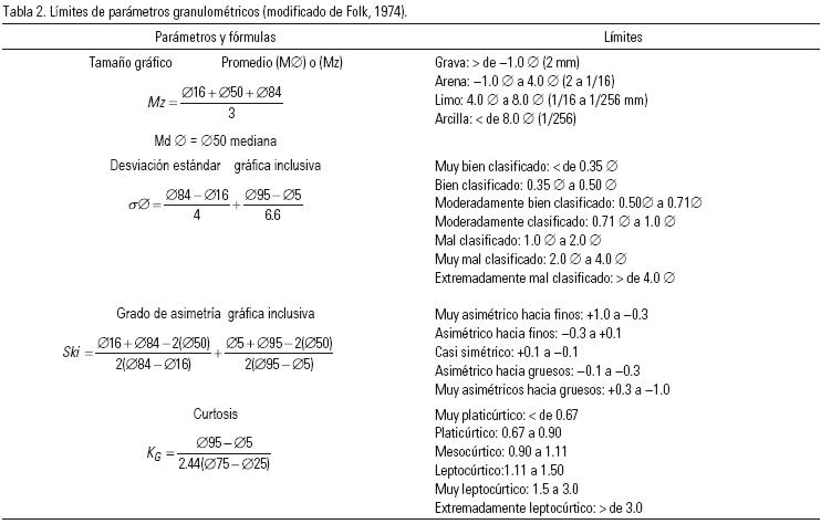 A los sedimentos se les realizó un análisis de tamaños o textura por el método de tamizado a cada cuarto de unidad φ y se calcularon los parámetros granulométricos: 1) tamaño gráfico promedio, 2) desviación estándar gráfica inclusiva, 3) grado de asimetría gráfica inclusiva y 4) curtosis, se graficaron e interpretaron los resultados utilizando los límites de los parámetros estadísticos, y se determinó la nomenclatura de los sedimentos de acuerdo con Folk (1974). En la Tabla 2 se muestran los parámetros y fórmulas propuestas por Wentworth (1922), modificados por Folk (1974).