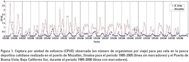 En la serie histórica observada de CPUE en las localidades de Mazatlán y Buena Vista (Fig. 1), se aprecia que en ambos sitios se presenta un evidente comportamiento cíclico con periodicidad anual que, a grandes rasgos, se caracteriza por una disminución en el índice de abundancia durante los meses del invierno para repuntar durante la temporada más cálida del año.