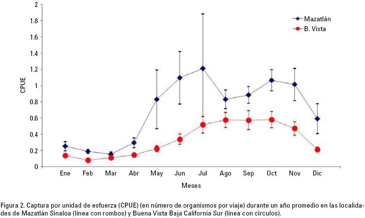 Se analizó información relativa a la captura (en número de organismos) y esfuerzo (en número de viajes) obtenidos en la pesquería deportiva cotidiana realizada en Mazatlán, Sinaloa durante el período 1979i2005 y en Buenavista, Baja California Sur de 1985 a 2006. De forma que la captura por unidad de esfuerzo (CPUE) utilizada como indicador de abundancia, tuvo como unidades el número de organismos por viaje de pesca realizado.