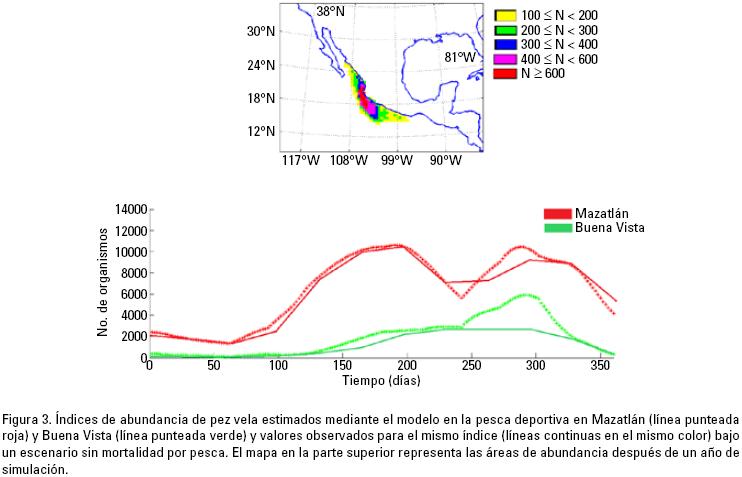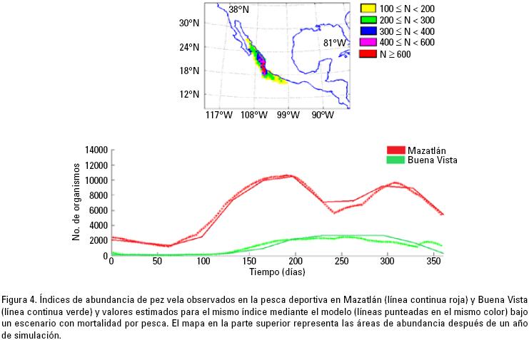 En la Figura 4 se presentan los resultados del modelo para un escenario donde existe mortalidad por pesca simulada en la región localizada al norte del puerto de Mazatlán, contrastados con los índices de abundancia observados para los puertos de Buena Vista y Mazatlán. Se utilizó una captura promedio de 0.019 veces la abundancia localizada en esa región por día, fracción que proporcionó el mejor ajuste a la diferencia entre las alturas de los picos observados en la zona de Mazatlán y Buena Vista.