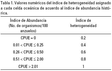 Modelación. La modelación se realizó mediante el lenguaje de programación Mat Lab versión 7.1. Con objeto de iniciar la construcción del modelo, la región localizada entre los 10° y 32° N y los 85° y 125° W, superficie que incluye a la Zona Económica Exclusiva Mexicana (ZEEM) en el Océano Pacífico, se dividió en subáreas de medio grado de latitud por medio grado de longitud, proceso que produjo un total de 4,000 celdas. Para representar la heterogeneidad ambiental, esto es, la variabilidad espacial de las características oceanográficas en dicha región, a cada una de estas unidades se le asignó un valor discreto cada 0.2 unidades en el intervalo cerrado [0, 1], de la siguiente manera: para las unidades secas (localizadas sobre el continente, con más del 50% de tierra) se les asignó un valor de 0. Para las celdas oceánicas, se utilizó el reporte de la Comisión Interamericana del Atún Tropical (CIAT) (Miyabe & Bayliff, 1987), del cual se obtuvo la distribución de las capturas por unidad de esfuerzo (CPUE) de la flota palangrera comercial (número de organismos/100 anzuelos), este índice de abundancia se asumió como el reflejo de la heterogeneidad ambiental de la región. Por tanto a las celdas que presentaron los valores más altos de CPUE, se les asignó un valor de 1, mientras que a las restantes se les asignaron valores de 0.8, 0.6, 0.4 y 0.2 suponiendo una proporcionalidad en relación a sus índices de abundancia históricos (Tabla 1).