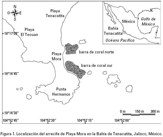 Área de estudio. Playa Mora es una ensenada con una longitud de poco más de medio kilómetro que se localiza en la punta noroeste de la Bahía de Tenacatita (19° 16'43'' N y 104° 52'16'' O) (Fig. 1). Frente a la playa se localiza un pequeño arrecife coralino costero dividido en dos barras paralelas a la costa y separados por una barra de arena. La barra de mayor dimensión, tiene una extensión cercana a los 300 m de largo y un máximo de 62 m de ancho. La barra norte presenta 210 m de largo y hasta 30 m de ancho; y aunque de menor longitud, tiene una altura promedio de 1.72 m, con un máximo de 3.20 m y un mínimo de 0.85 m. Los corales dominantes del arrecife son especies con crecimiento ramificado del género Pocillopora (P. capitata, P. damicornis, P. meandrina y P. verrucosa) y en menor medida especies incrustantes de las familias Poritidae (Porites panamensis) y Agariciidae (Pavona gigantea) (LópezUriarte & RíosJara, 2004).