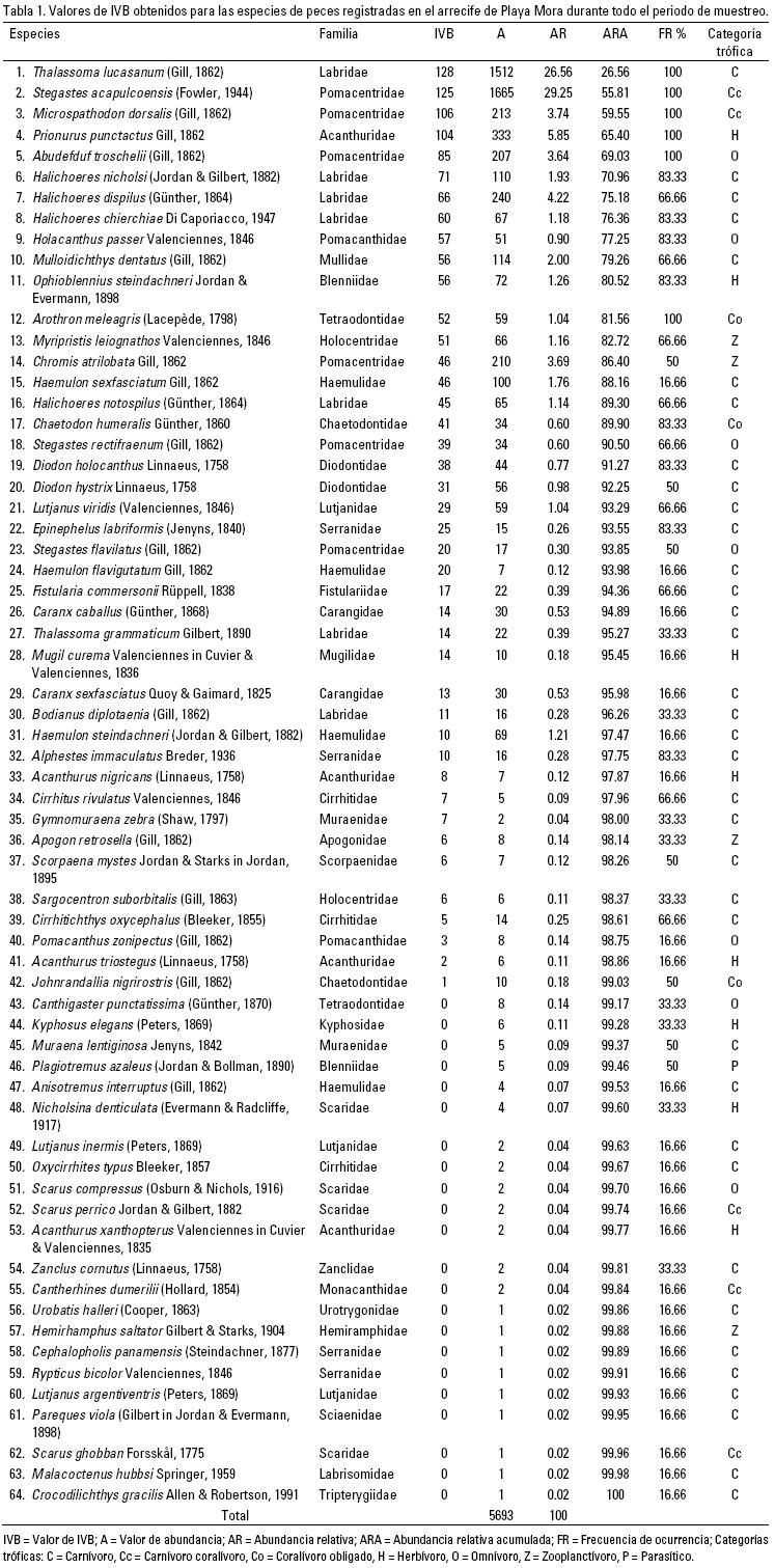 Mediante el IVB se determinaron 18 especies dominantes en el arrecife, que representaron el 90% de la abundancia relativa acumulada, con una frecuencia de ocurrencia en los muestreos de entre 50 y 100%, excepto Haemulon sexfasciatum que tuvo una frecuencia de 16.66% (Tabla 1). De estas 18 especies, tan solo Thalassoma lucasanum y Stegastes acapulcoensis obtuvieron un valor de abundancia relativa acumulada cercano al 56% y una frecuencia de ocurrencia del 100%. Por el contrario, se registraron nueve especies consideradas raras (Urobatis halleri, Hemirhamphus saltator, Cephalopholis panamensis, Rypticus bicolor, Lutjanus argentiventris, Pareques viola, Scarus ghobban, Malacoctenus hubbsi y Crocodilichthys gracilis) ya que solo se obtuvo registro de un solo individuo de cada una.