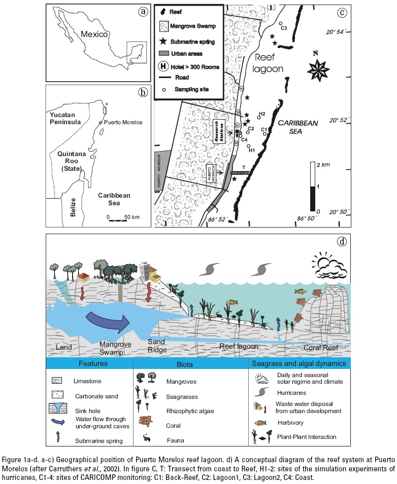 The Puerto Morelos reef system on the NE coast of the Yucatan Peninsula (Fig. 1a-c) is an open-ocean connected highly flushed coastal system with a water residence time of 3 h under normal wave conditions (Coronado et al., 2007). It is situated in the northern part of an extensive barrier-fringing reef complex that extends from Belize to the Strait of Yucatan. An extended fringing reef forms a 2-4 m deep reef lagoon, characterized by calcareous sand that is stabilized by the seagrass meadows. Inland wetlands are separated from the sea by a 2-3 m high and 100-200m broad sand bar (Fig. 1c). Mean surface-water temperatures vary between 25.1 °C in mid winter and 29.9 °C in late summer (monthly averaged temperature from 1993 until 2005 (Rodríguez-Martínez et al., 2010). From November until April cold fronts or "Nortes" produce decreases in air and seawater temperature. The average rainfall is 1060.6 mm y-1 (data from 1993 to 2004), without a clearly defined dry or wet season. During periods of exceptionally heavy rains, overflow of mangrove wetlands bring brackish tannin colored waters into the lagoon. The Yucatan limestone is extremely karstic and rainwater rapidly infiltrates into the aquifer, resulting in the absence of surface drainage or rivers and the water passes through an immense network of underground caves and channels to vent into the marine coastal areas through submarine springs ("Ojos de agua") and fissures (Fig. 1c). Thus, the lagoon environment is principally governed by marine conditions and the salinity varies little throughout the year (between 35.8 and 36.2%). The hurricane season extends from June to November, peaking between August and October. The main hurricanes directly affecting this area over the last 25 y were Gilbert (hurricane force 5, October 1988) and Wilma (hurricane force 4, October 2005) and other five hurricanes passed close to the study area, but did not have a major impact on the biota (Rodríguez-Martínez et al., 2010). The mean tidal range is very small (~17 cm) with a maximal variability in sea level of 32 cm (Coronado et al., 2007). The water in the lagoon is typically oligothrophic with low mean nitrite (0.06 μM), nitrate (13.9 μM) and phosphate (0.46 μM) concentrations (19821983, Merino & Otero (1991). Likewise, porewater nutrient concentrations within the Puerto Morelos Reef Lagoon (NH4+ 1.2-3.42 μM, DIN 2.8-5.1 μM and PO4-3 1.0-2.7 μM (Duarte et al., 1995; Carruthers et al., 2005) are low compared to global mean values for seagrass meadows of 86μM-NH4+ and 12 μM-PO4-3 (Hemminga & Duarte, 2000). Puerto Morelos was a small fishing village until the early 1980's, but since it has developed rapidly as tourism has become the main economic activity. Amongst the major attractions are the crystal clear seas, the white-sanded beaches and the reef ecosystem. The initial population of <1,000 inhabitants in the early 1980s developed into a rapidly growing community of ~15,000 inhabitants in 2008, and the number of hotel rooms experienced a exponential increase from ~400 rooms in 1998 to ~6,500 in 2008 (source INEGI, Mexico). In 1998, Puerto Morelos reef was declared a marine protected area and in average it receives ca. 200,000 visitors per year (http://www.conanp.gob.mx).