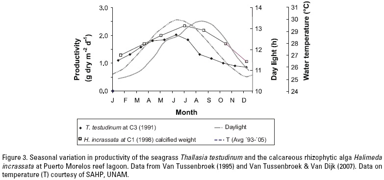 Seasonal variability. The growth rates of the seagrass Thalassia testudinum and the alga Halimeda incrassata in Puerto Morelos reef lagoon vary seasonally (Fig. 3). Puerto Morelos, at <210 latitude, experiences a difference of ~2.5 h in daylight and ~5 0C temperature between winter minima and summer maxima (Fig. 3). Most likely light and the solar cycle are the driving forces of seasonal changes in the open-ocean connected reef lagoon and there are only few reports of solar-related seasonal fluctuation this far south (Van Tussenbroek 1995; Van Tussenbroek & Van Dijk, 2007). The magnitude of the seasonal variations in growth rates are reflected in minor fluctuations in the dry weight of the seagrass shoots or thalli (Van Tussenbroek 1994a, 1995; Van Tussenbroek & Van Dijk, 2007). But at the level of community, seasonal changes in standing crop are not obvious as is indicated by the following study.