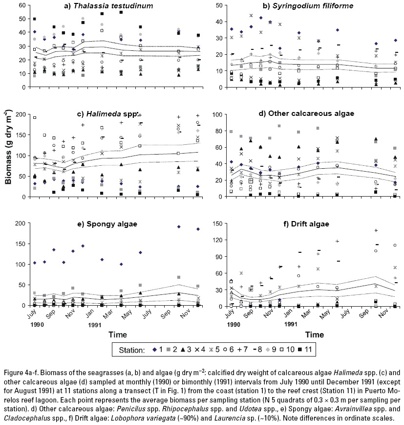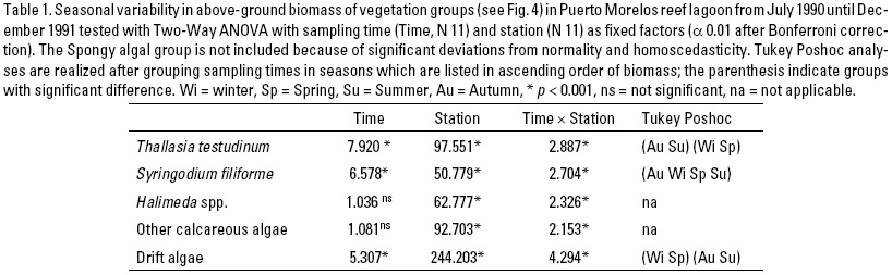 From June 1990 until October 1991, the above-ground biomass of seagrasses and algae was determined at monthly or bimonthly intervals (and once at an interval of three months) at 11 stations from coast to reef following the protocol described by Van Tus-senbroek & Van Dijk (2007) for H. incrassata. The vegetation was divided into large morphological groups being: the seagrasses Thalassia testudinum and Syringodium filiforme, Halimeda spp., other calcareous algae [Penicillus spp., Rhipocephalus spp., Udotea spp.), Spongy algae (Avrainvillea spp., Cladocephalus spp.) and drift algal groups (mainly Lobophora spp. with less Laurencia spp.). The calcareous algae do not show significant seasonal variations (Table 1), and even though above-ground biomass of the seagrasses varies with time, maximal summer or minimal winter values are not obvious (Fig. 4, Table 1). At this level of community organisation, the effects on population densities of grazing, competition for light with drifting algal masses, storms, biotur-bation, natural recruitment or death may be of more influence to total standing crop than individual growth rates and weights of the plants. The drifting algal group is an exception, and these algae attain their maximal biomass during late Summer-Autumn and minimal abundance in the Winter-Spring (Fig. 4, Table 1). Rodríguez-Almázan (1997) reports that the cover of masses of the dominant drifting brown alga Lobophora variegata (Lamouroux) Womersly (ruffled form) is related to periods of heavy wave-action caused by during periods of northern winds in Winter and Spring or tropical storms (which did not occur in 1990-1991). The drifting algae may play an important role as a habitat to meiofauna, including the juvenile spiny lobster (Panulirus argus Latreille, 1804; Briones Fourzán & Lozano-Álvarez, 2001), thus variations in their abundance affect the diversity and abundance of associated fauna (Estrada-Olivo, 1999).