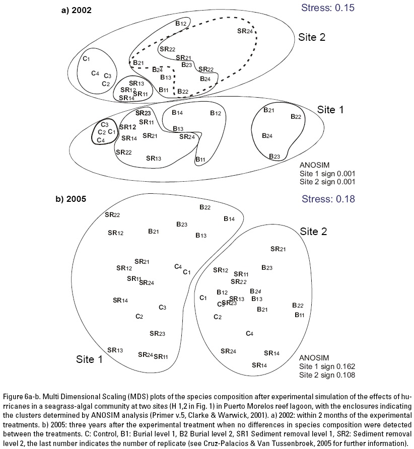 Major disturbances 1: Hurricanes. The seagrass-algal community in Puerto Morelos reef lagoon is surprisingly resilient to the impact of hurricanes and most likely the reef barrier functions as a major protection structure. For example, during hurricane Wilma (October 2005, force 4, winds ~240 km h-1, duration ~63 h) waves attained a mean peak height of ~11 m outside the reef tract (Es-calante-Mancera et al., 2009), which were reduced to ~3 m within the reef lagoon (Hydrological and Meteorological Service, Unidad Academica Puerto Morelos, unpublished data). Major hurricane Gilbert (force 5) passed over Puerto Morelos in September 1988 with winds ~300 km h-1 (duration ~8 h) and its impact on T. testudinum was evaluated by means of retrospective analysis. Most populations of this seagrass suffered from either sediment burial or erosion (Marbà et al., 1994; Van Tussenbroek, 1994c), but depending on environmental settings the population sizes decreased only slightly, and when decreases were more substantial, recovery was initiated after 1-2 y (Van Tussenbroek, 1994c). Passage of hurricane Wilma (October 2005) over Puerto Morelos, Mexican Caribbean, caused significant decrease in population density of the seagrass Syringodium filiforme and rhizophytic calcareous algae, whereas populations of the seagrass Thalassia testudinum and Halimeda spp. were almost unaffected (Van Tussenbroek et al., 2008b). These impacts of the hurricane supported the results of earlier experiments simulating sediment removal and burial by hurricanes (Cruz-Palacios & Van Tussenbroek, 2005). Thus, apart from obvious impacts such as destruction of seagrass beds, hurricanes may also change the community structure of persistent beds through species-specific elimination. In the later case, recovery of the community may be relatively fast. Experimental burial and sediment removal resulted in a distinct community (Cruz-Pa-lacios & Van Tussenbroek, 2005), but the differences in species composition between the experimental and control plots was inexistent after three years (Fig. 6). Hurricane Wilma eliminated the lush vegetation of a coastal fringe of 10-60 m by deposition of a 0.5-1.0 m thick layer of sand. At present, primary succession in this zone follows classical pattern of succession through facilitation (Williams, 1990; Van Tussenbroek et al., 2006a). The early arrivers were seedlings of Halodule wrightii(after ~6 months) and Syringodium filiforme (after ~1 y, Van Tussenbroek, unpublished data) and rhizophytic algae. First recruits of H. incrassata in the denuded coastal area after hurricane Wilma were found 8 months after passage of the hurricane at an average density of 1.3 juvenile or young thalli per 100 m2, and were most likely from sexual origin (Van Tussenbroek & Barba-Santos, 2011).